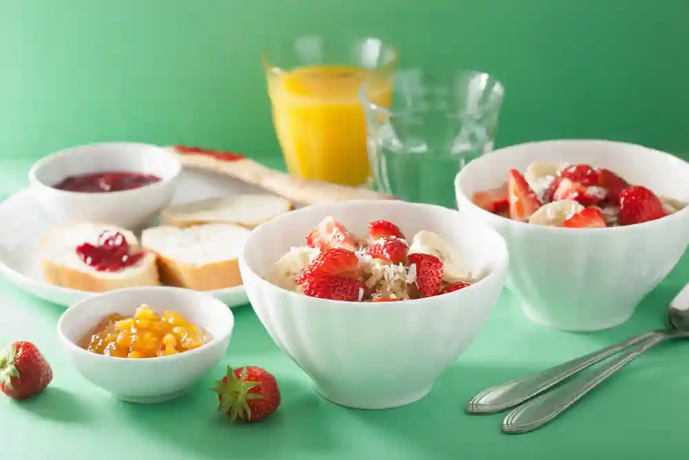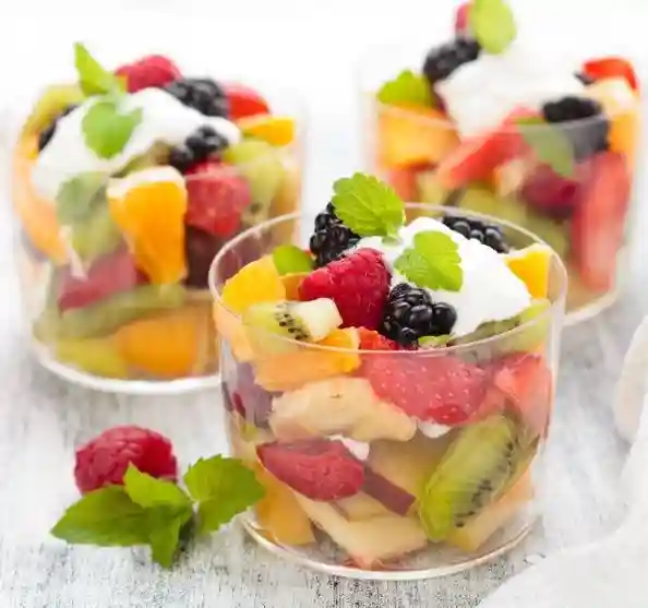Hot beverage, Fresh Fruit Juice, Fruit Salad, Yogurt and Muesli