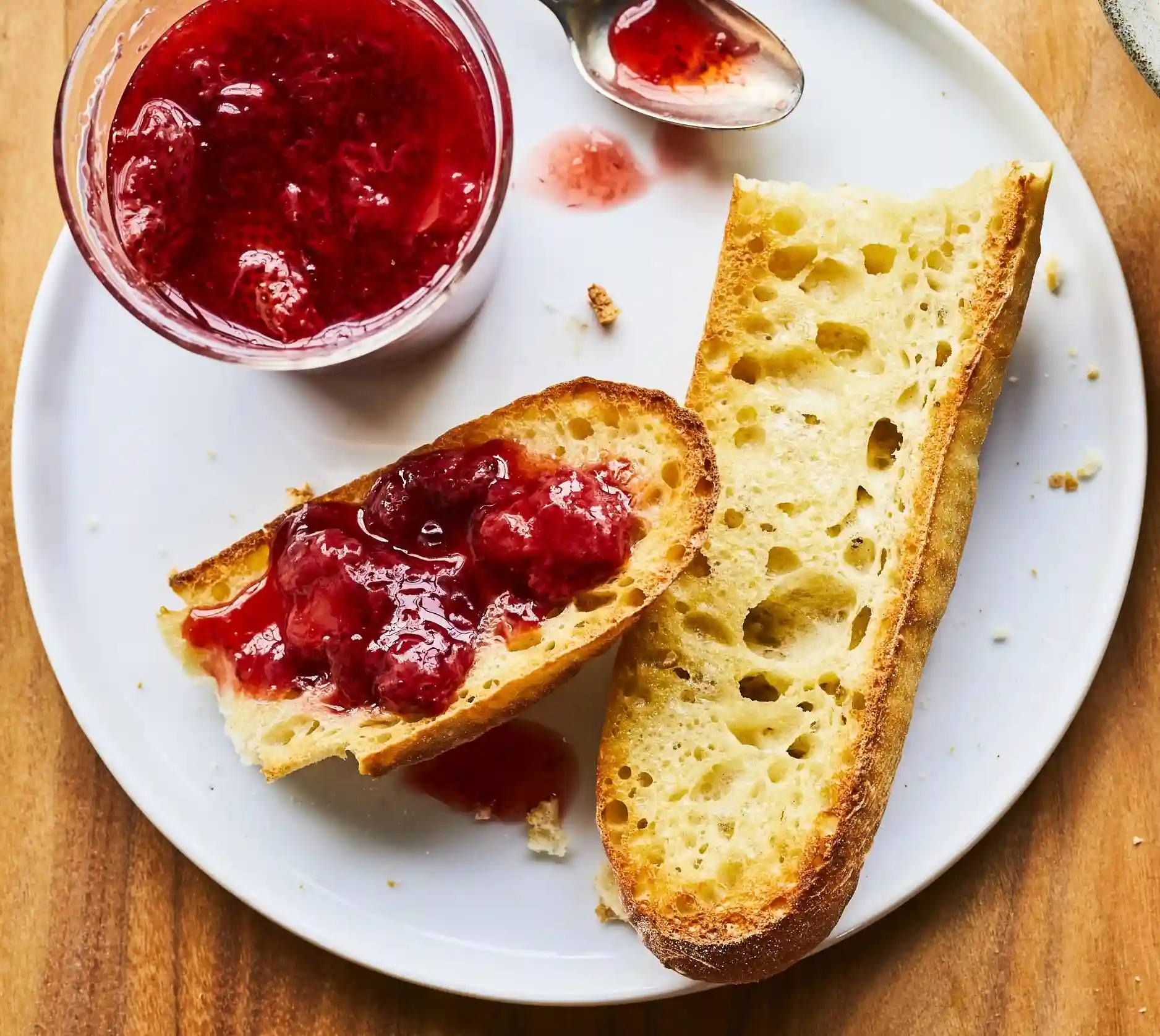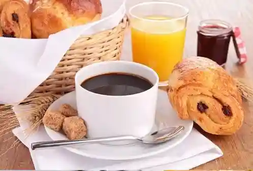 Hot beverage, Fruit juice, Half a baguette, Jam, Viennese pastries