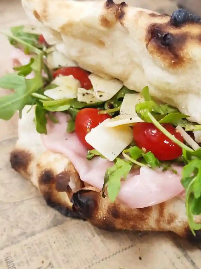 Tomato Sauce, Italian Raw Ham, Cherry Tomato, Arugula, Parmesan, Pesto, Mozzarella, Olive, Oregano