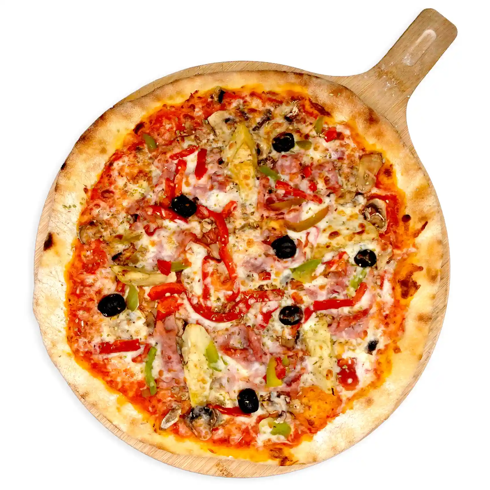 Tomato sauce, Mozza, Emmental, Mushroom, Ham, Peppers, Artichoke, Olives