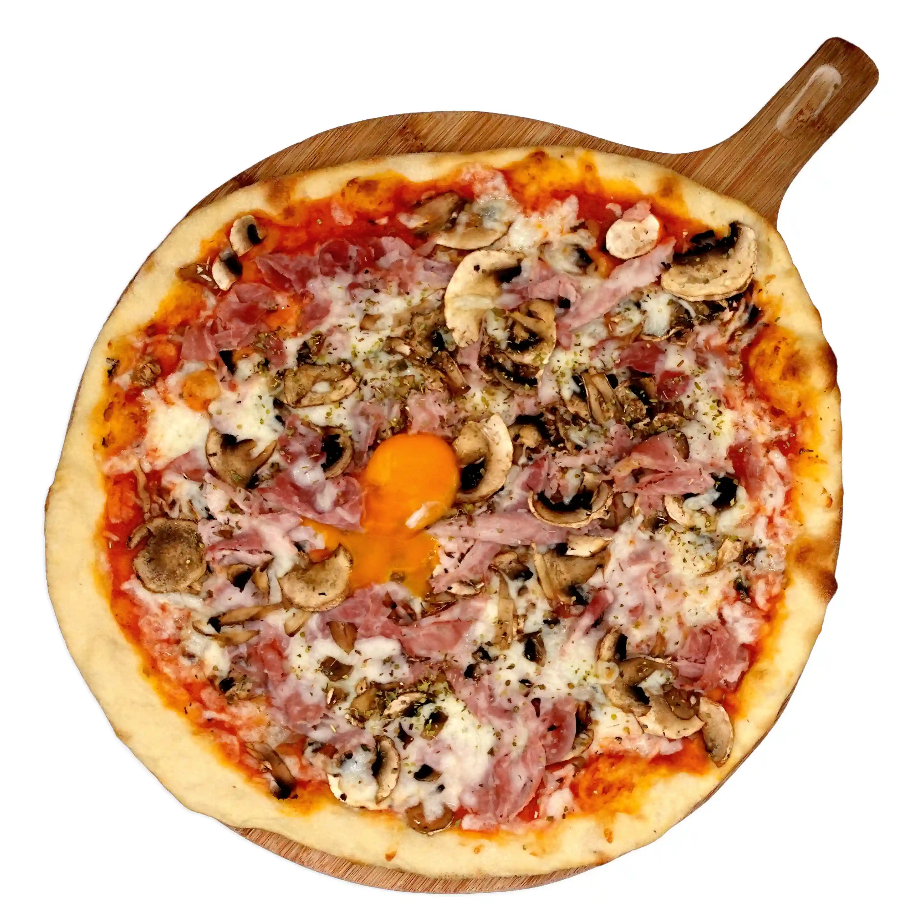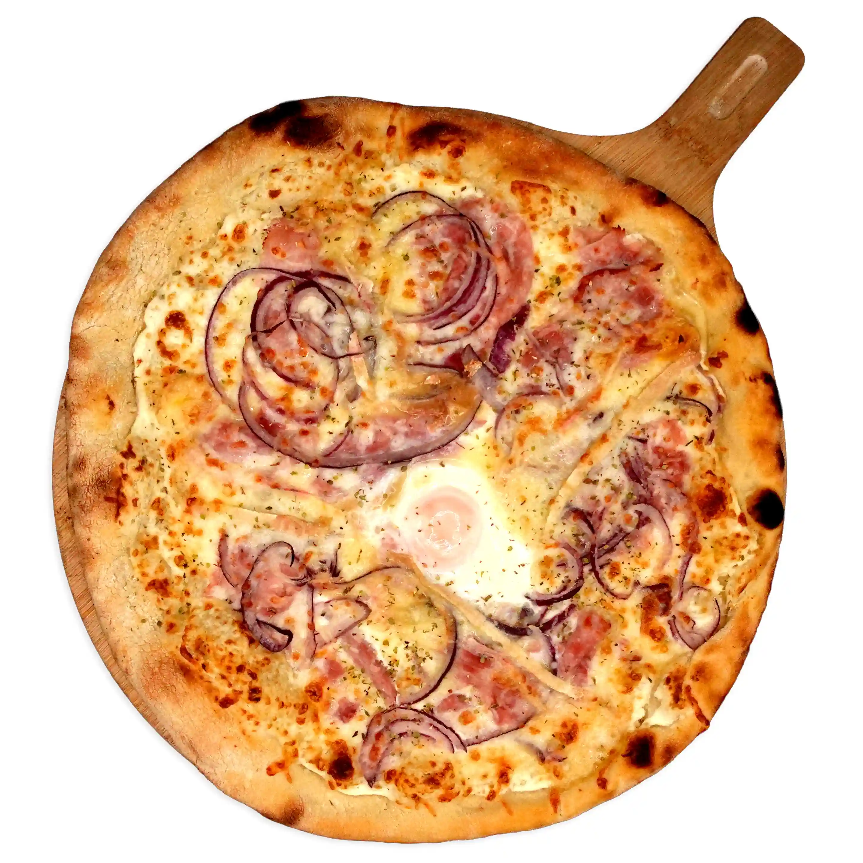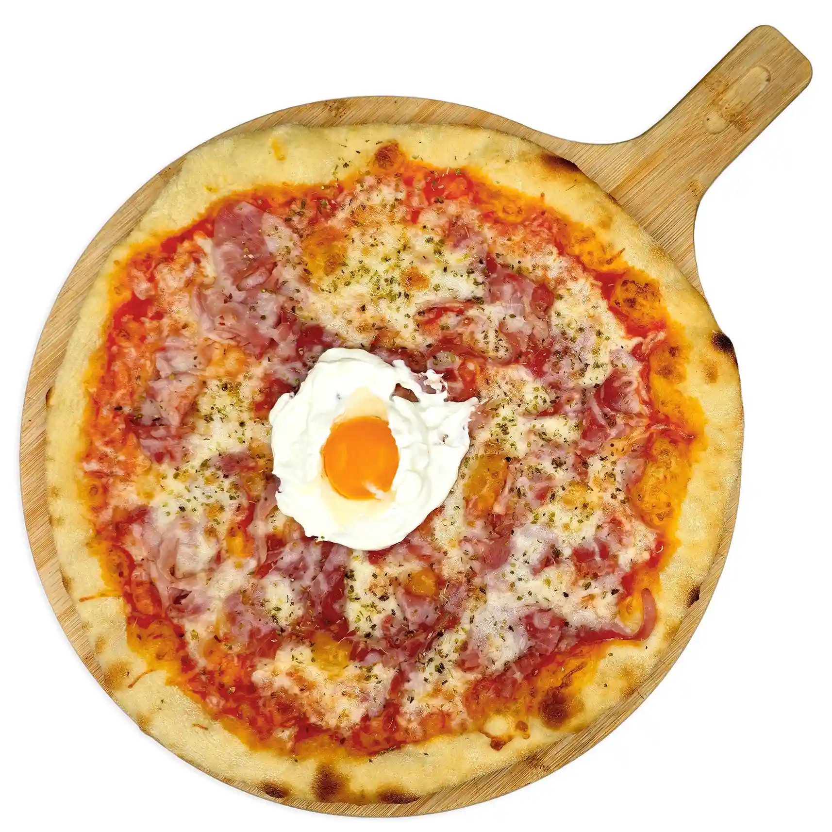 Tomato sauce, Mozza, Emmental, Ham, Crème fraîche, Egg