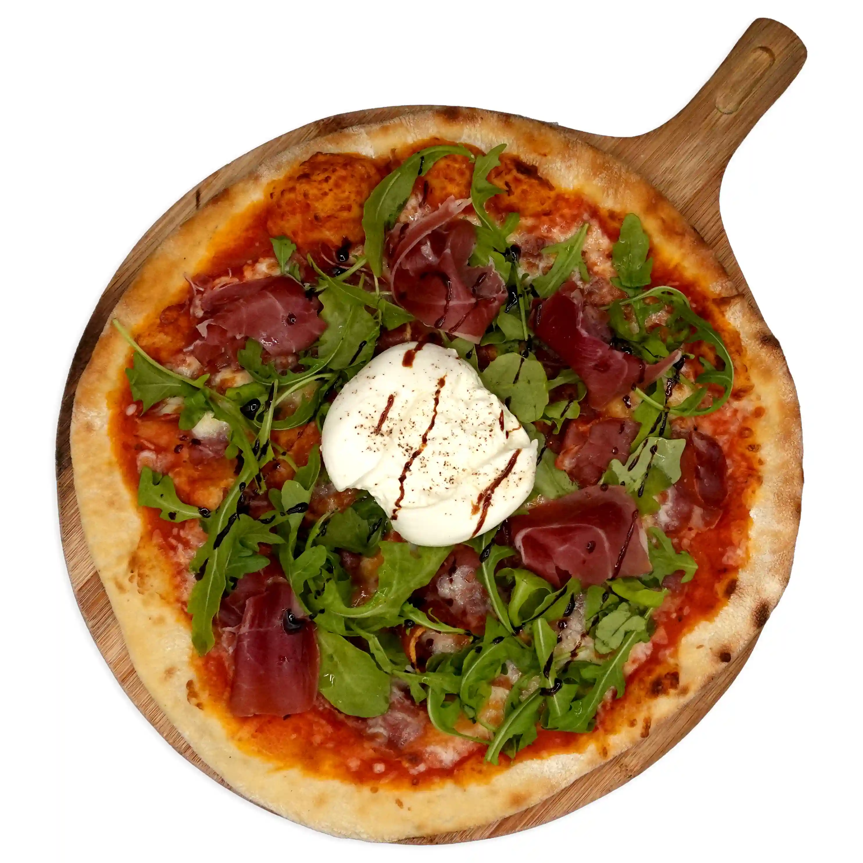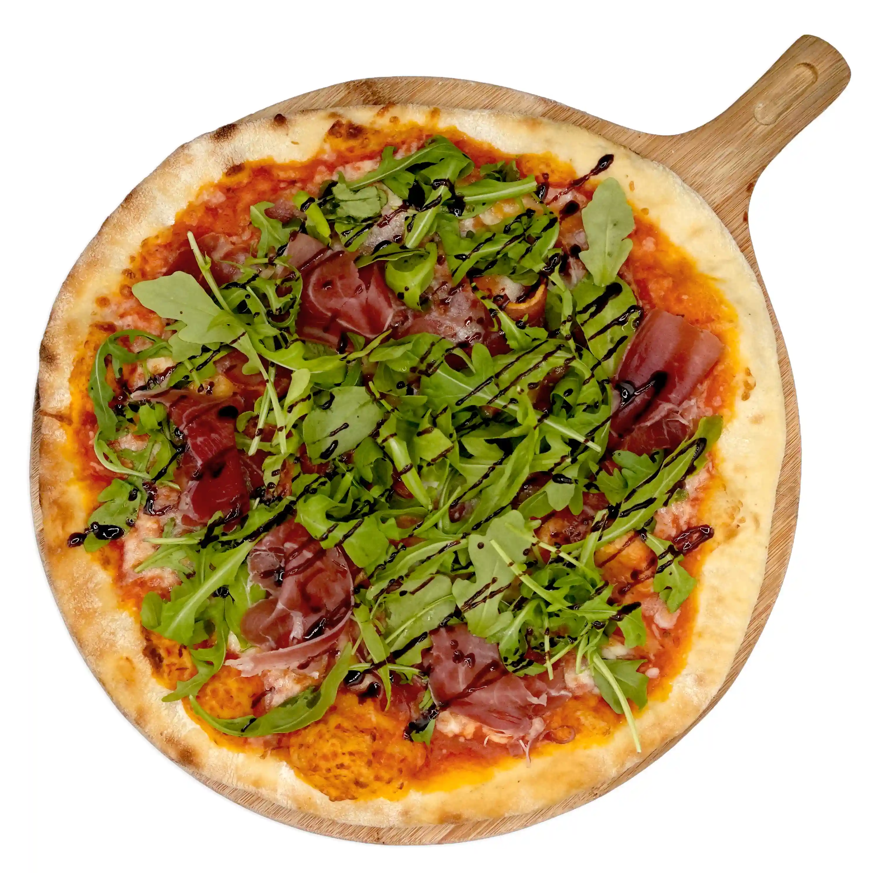 Tomato sauce, Mozza, Emmental, Raw ham, Arugula, Balsamic glaze, Buffala