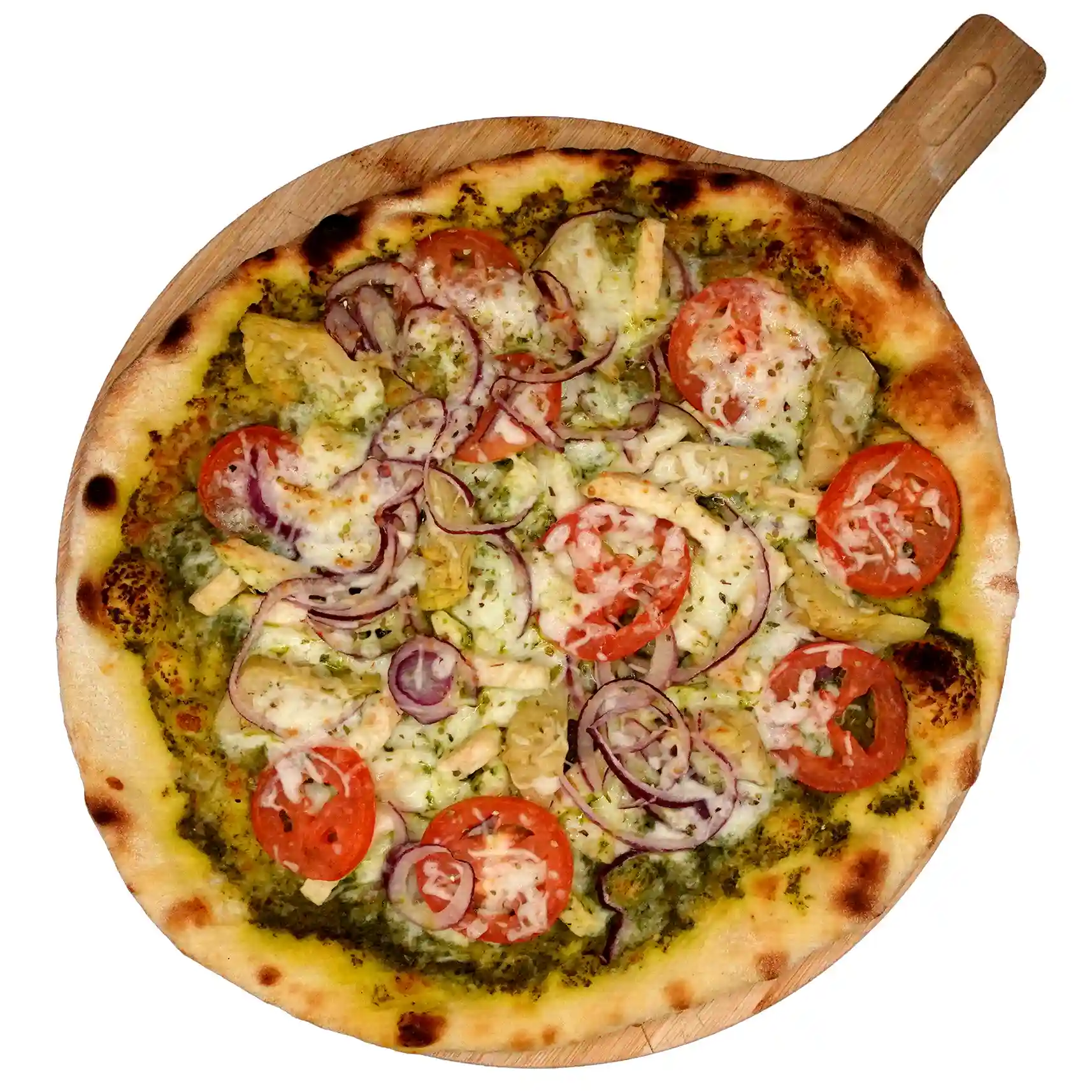 Pesto, Mozza, Emmental, Chicken, Fresh tomatoes, Onions, Artichoke, Garlic