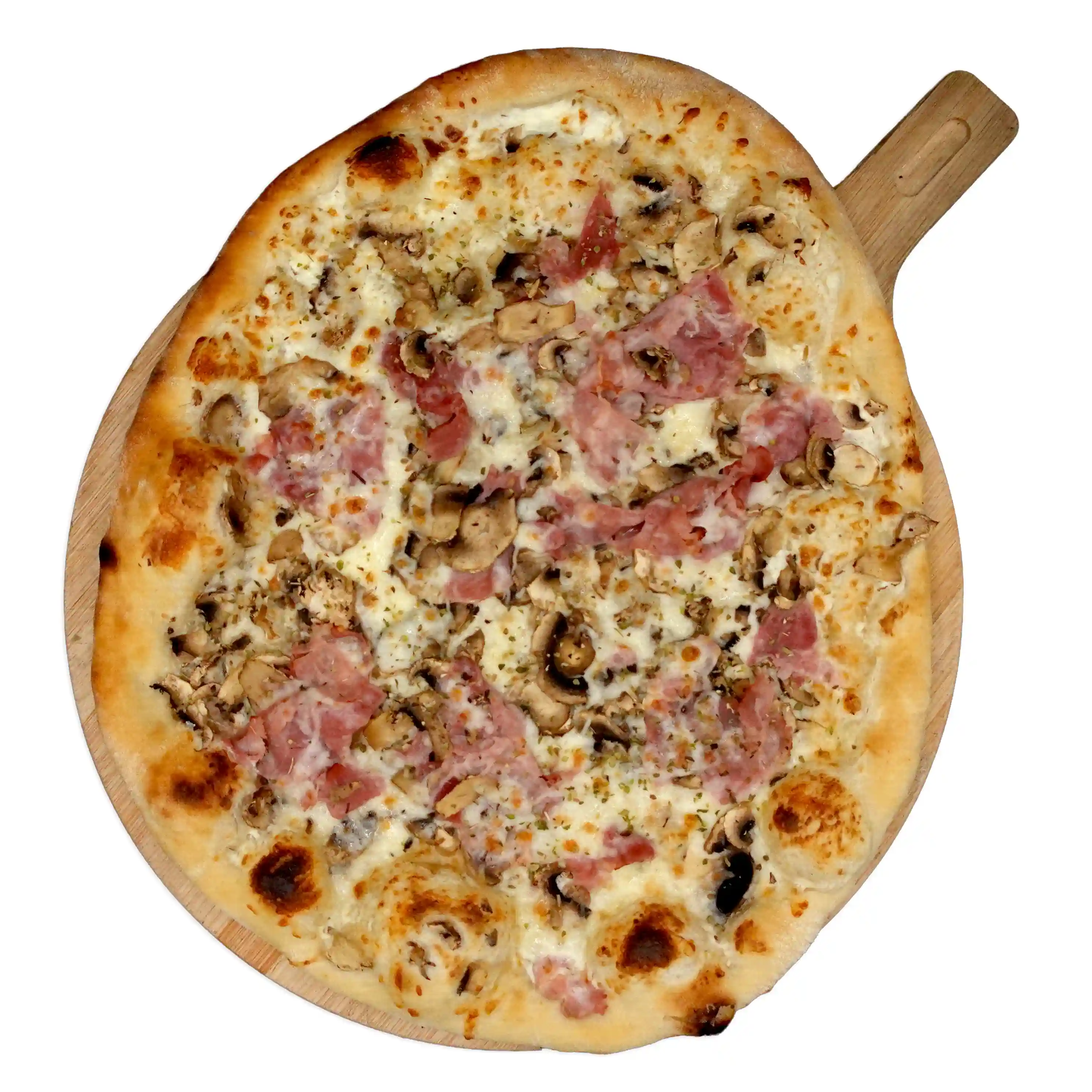 Tomato sauce, Mozza, Emmental, Ham, Crème fraiche, Mushrooms