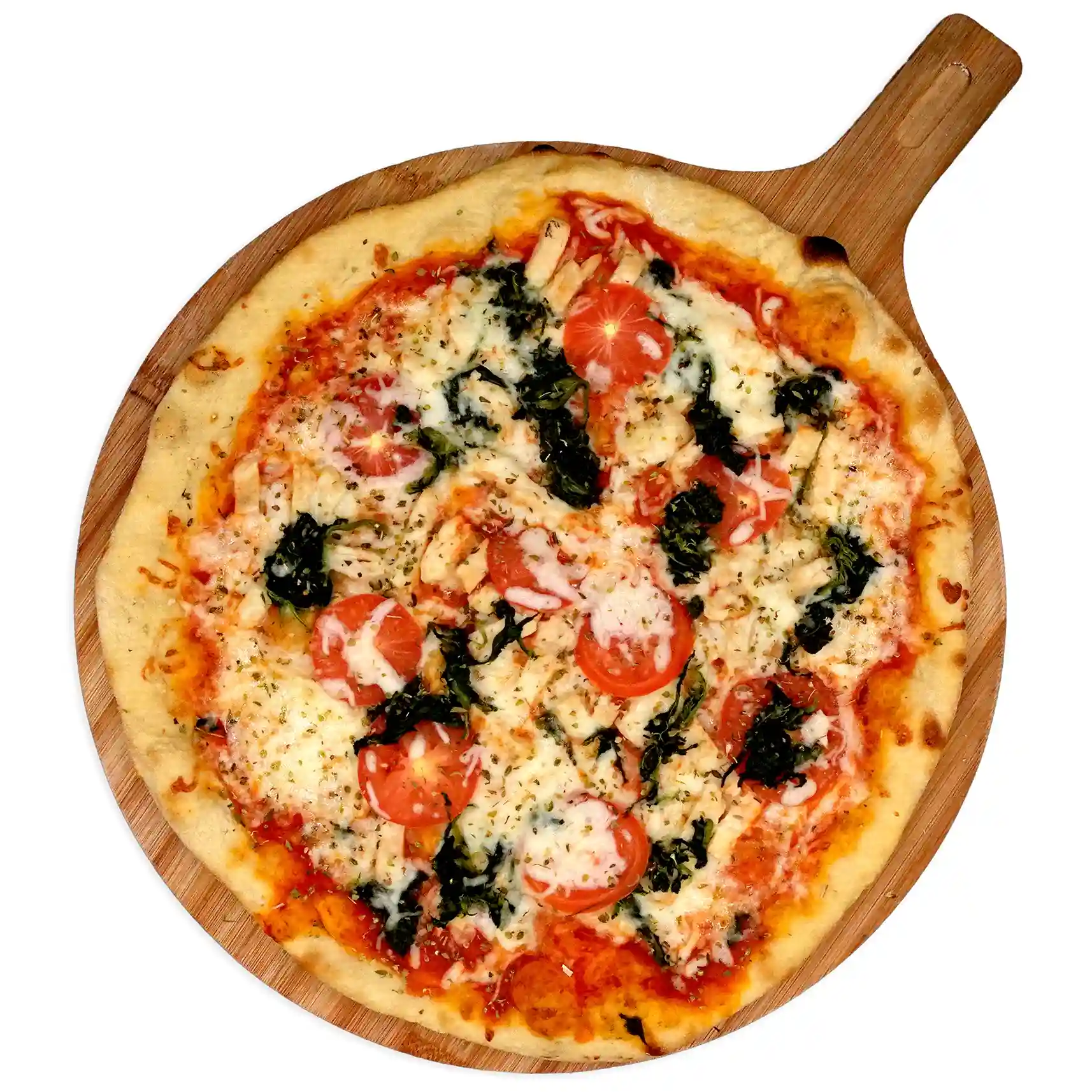 Tomato sauce, Mozza, Emmental, Chicken, Spinach, Fresh tomatoes