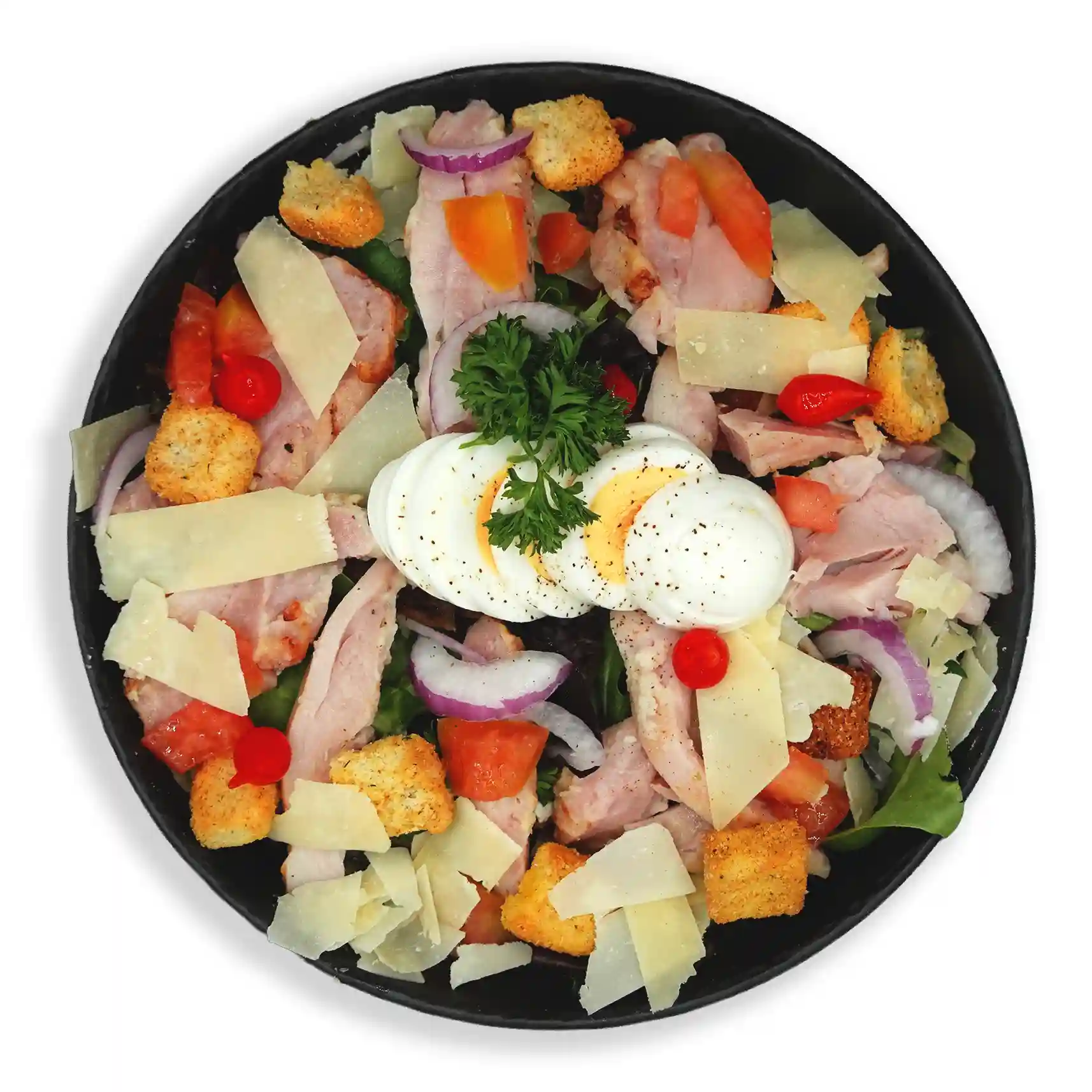 Mesclun, Cherry tomatoes, Shallots, Garlic, Egg, Croutons, Parmesan, Chicken, Caesar sauce