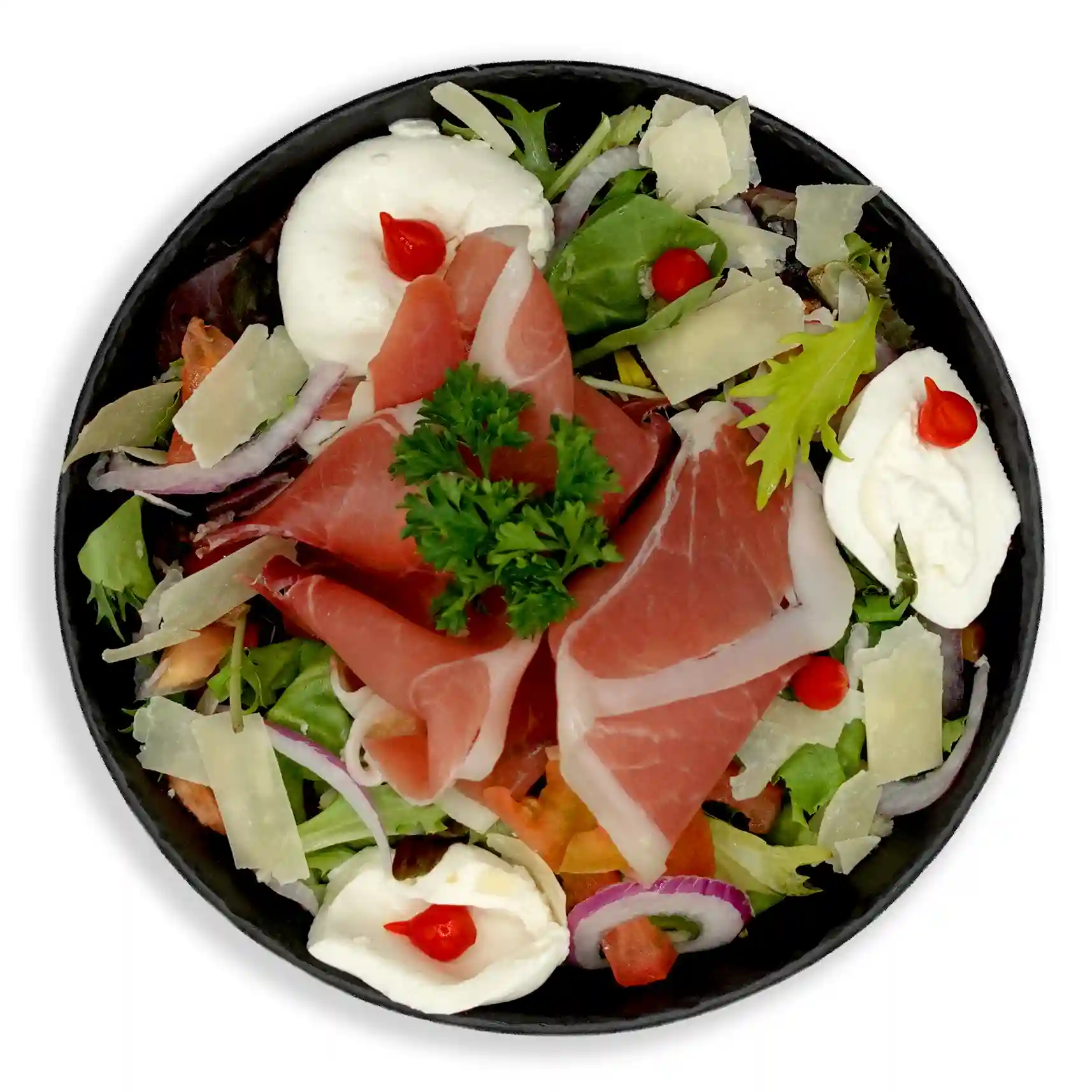 Mesclun, Cherry tomatoes, Shallots, Garlic, Raw ham, Mozza, Pepper drops