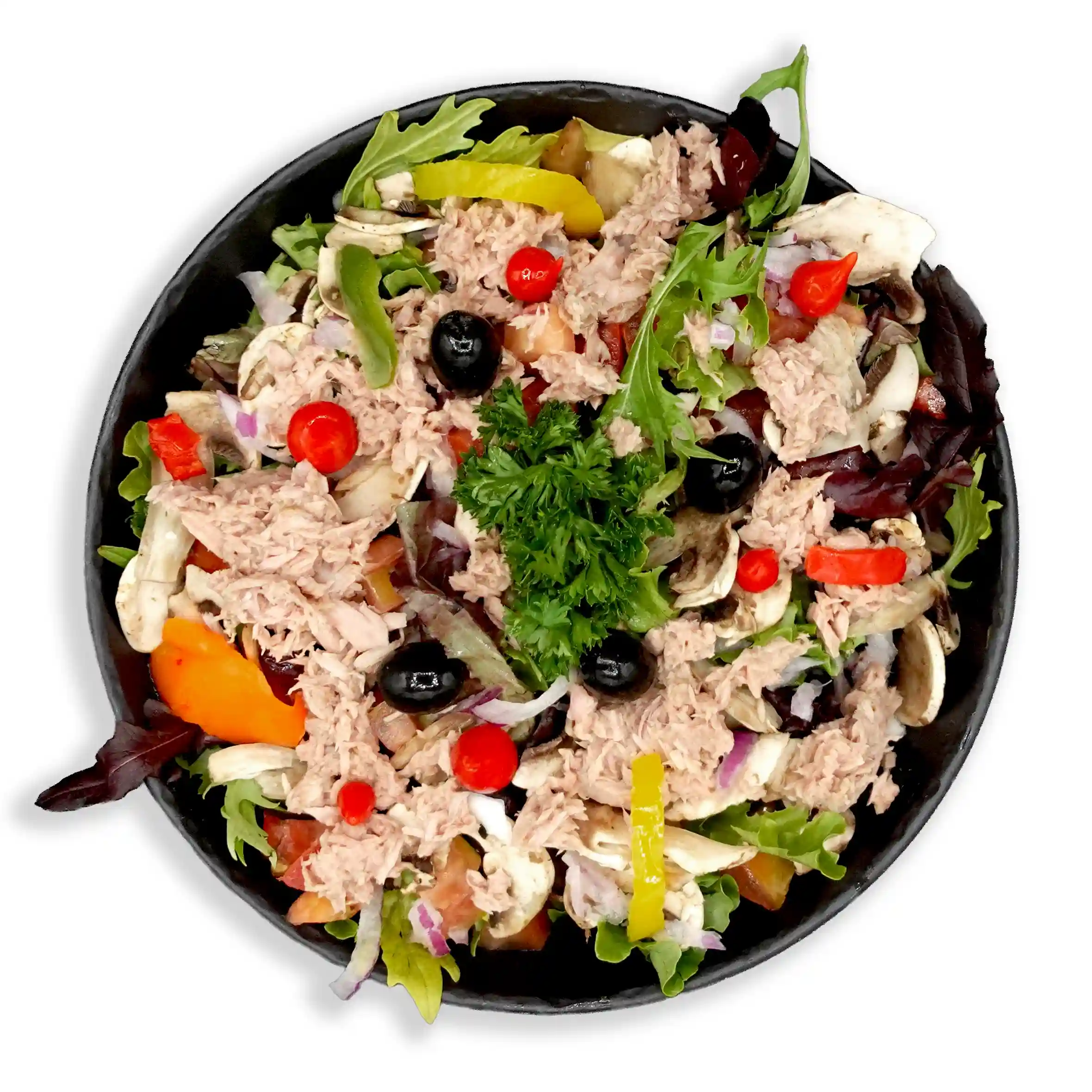 Mesclun, Cherry tomatoes, Echalottes, Garlic, Onions, Pepper drops, Tuna, Pesto