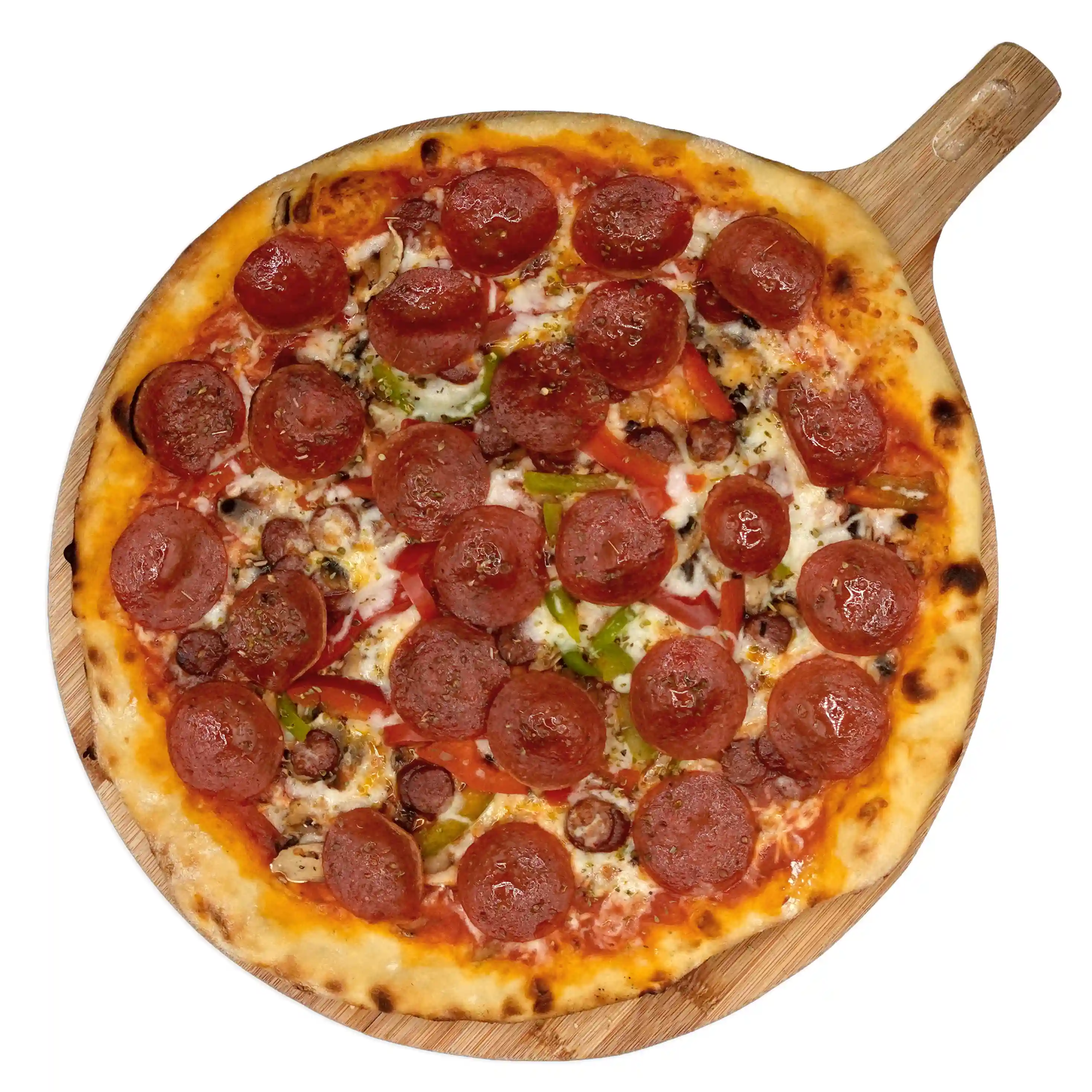 Tomato sauce, Mozza, Emmental, Pepperoni, Merguez, Mushrooms, Peppers