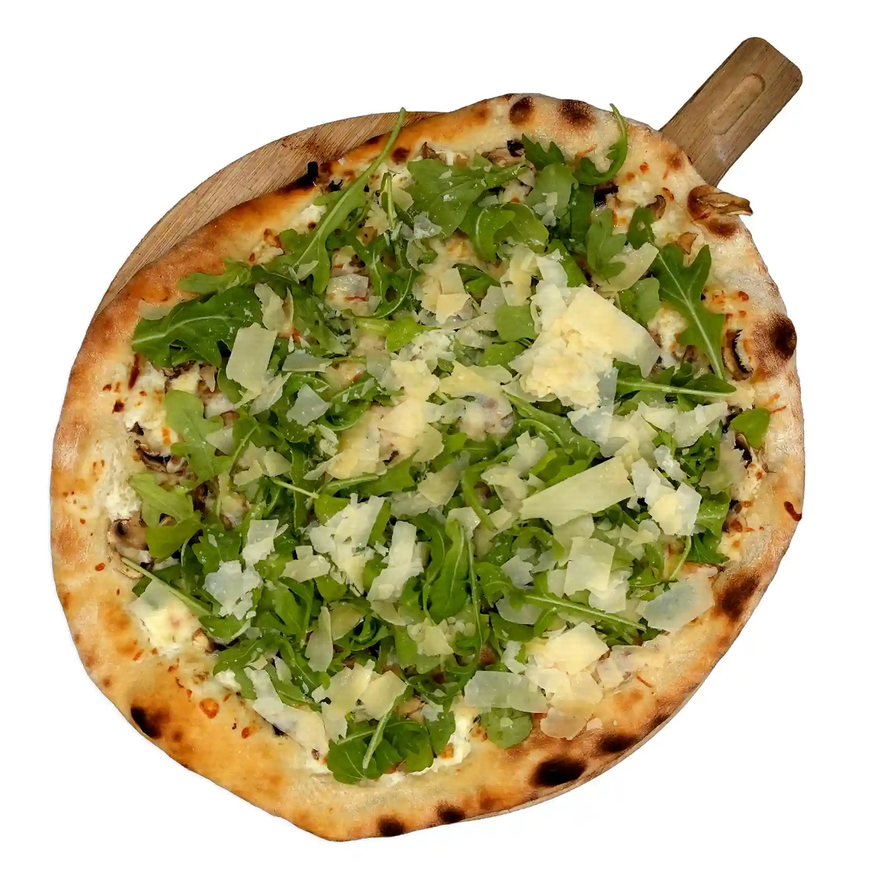 Crème fraîche, Mozza, Emmental, Mushrooms, Arugula, Truffle oil, Parmesan shavings