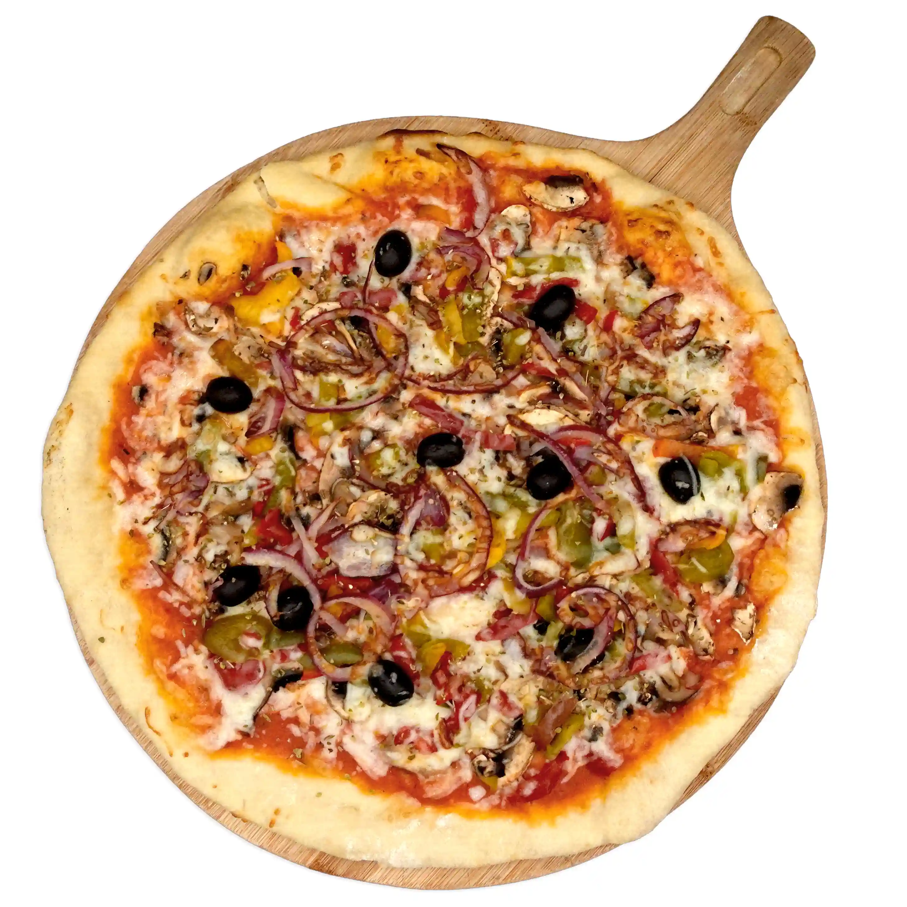 Tomato sauce, Mushrooms, Peppers, Onions, Spinach, Olives, Mozza, Emmental