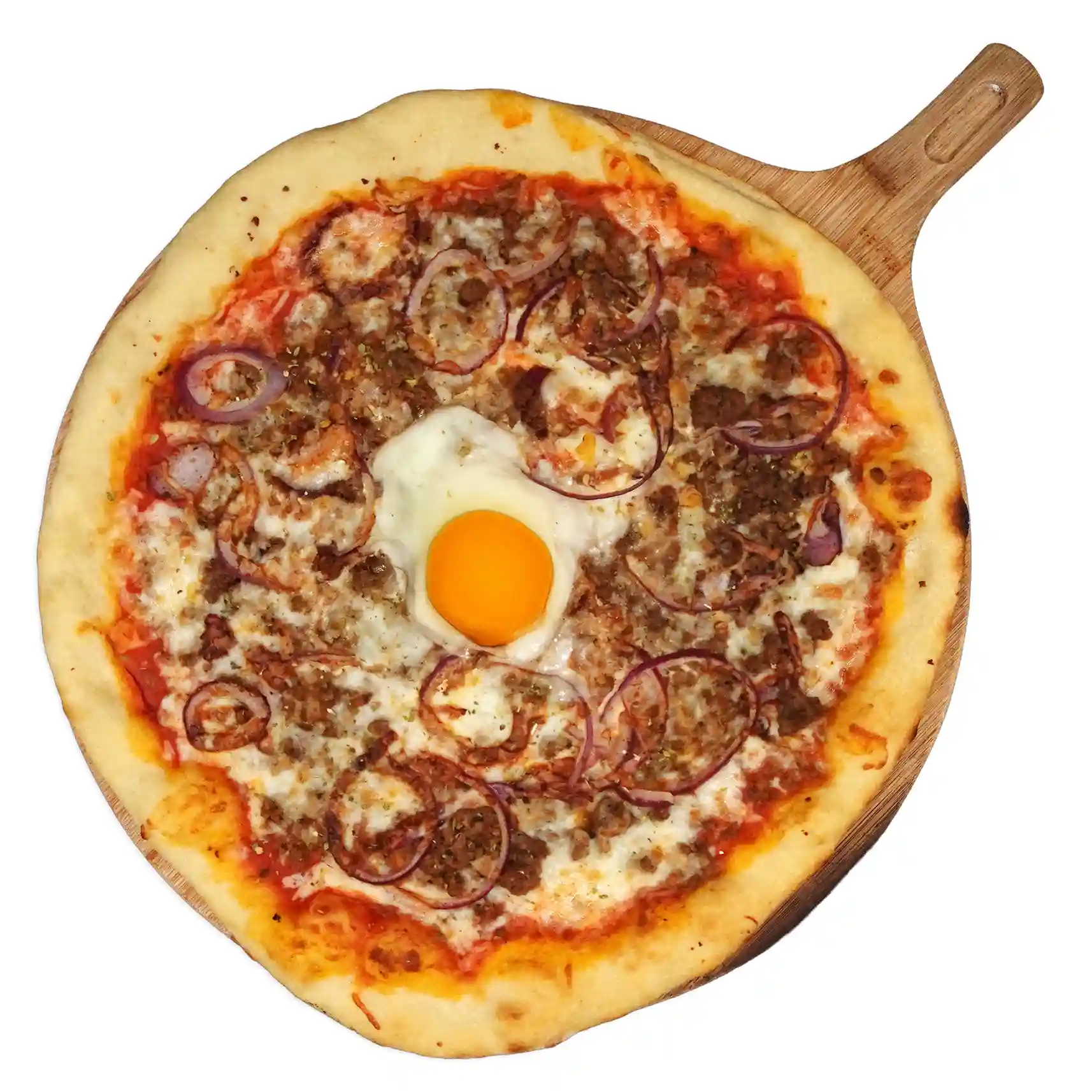 Tomato sauce, Mozza, Emmental, Minced meat, Onions, Egg