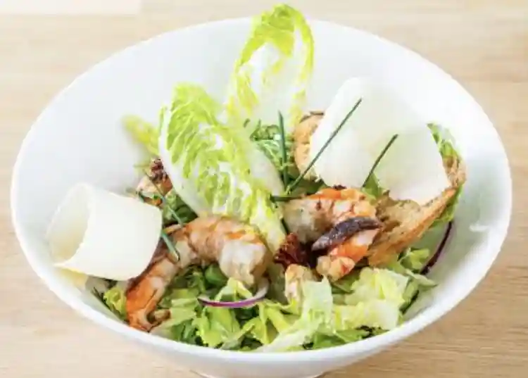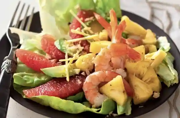 Mesclun salad, Smoked chicken, Three fried shrimps, Diced pineapple, Grapefruit supremes, Mango, Cherry tomatoes, Honey…