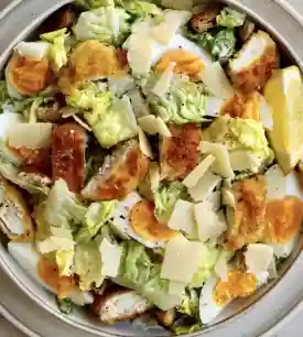 Romaine salad, croutons, cherry tomatoes, hard-boiled egg, Parmesan shavings, Caesar sauce with anchovies