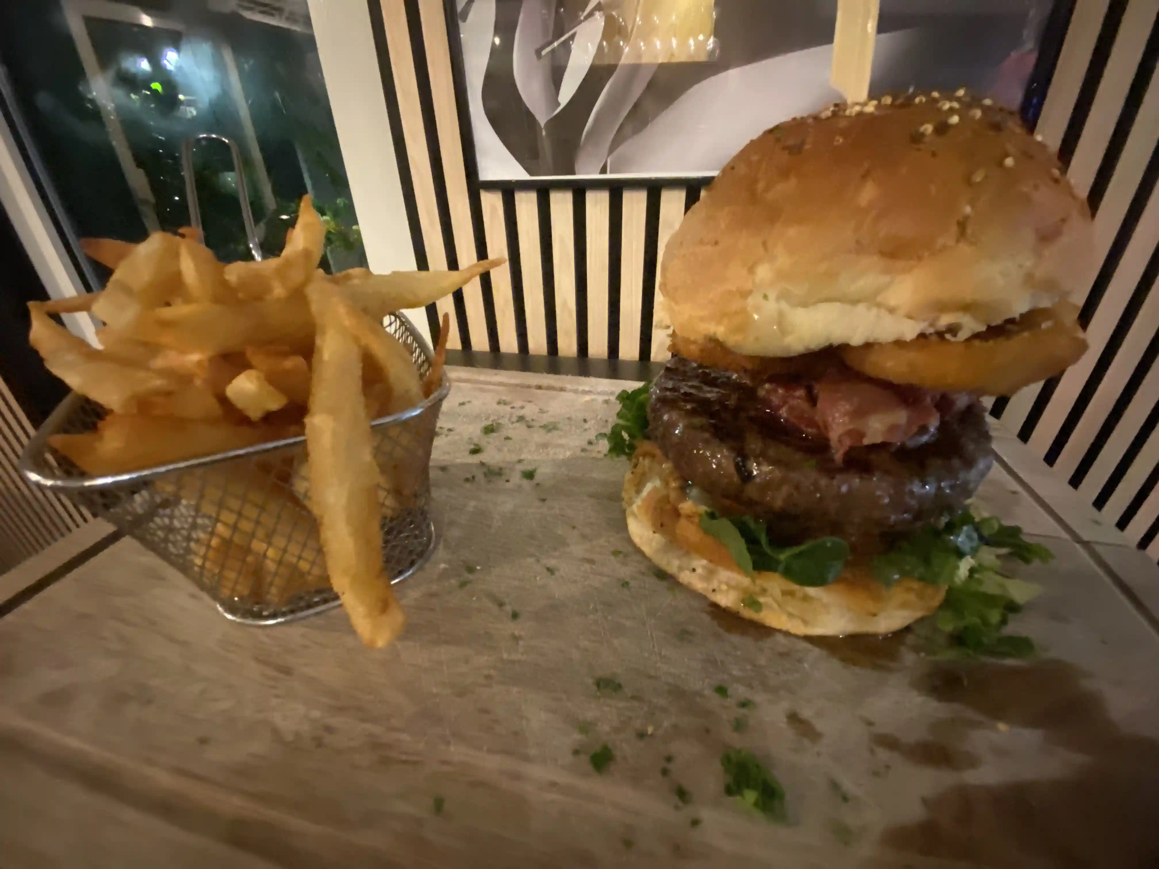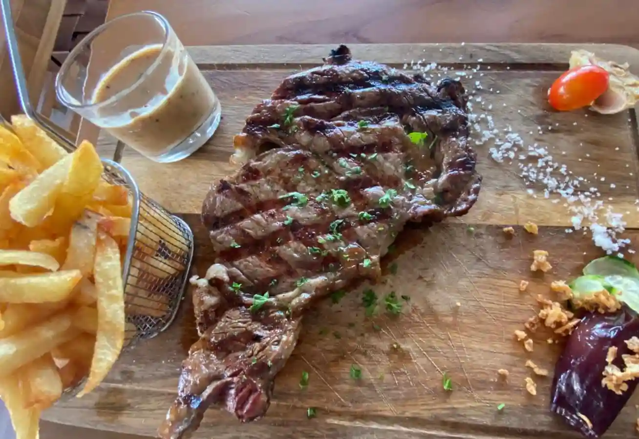 Steak 150gr ,Tomates fraîche ,Pancetta grillées ,Conte fromage ,Salades ,Onion Rings ,Relish ,Sauce Tartare maison