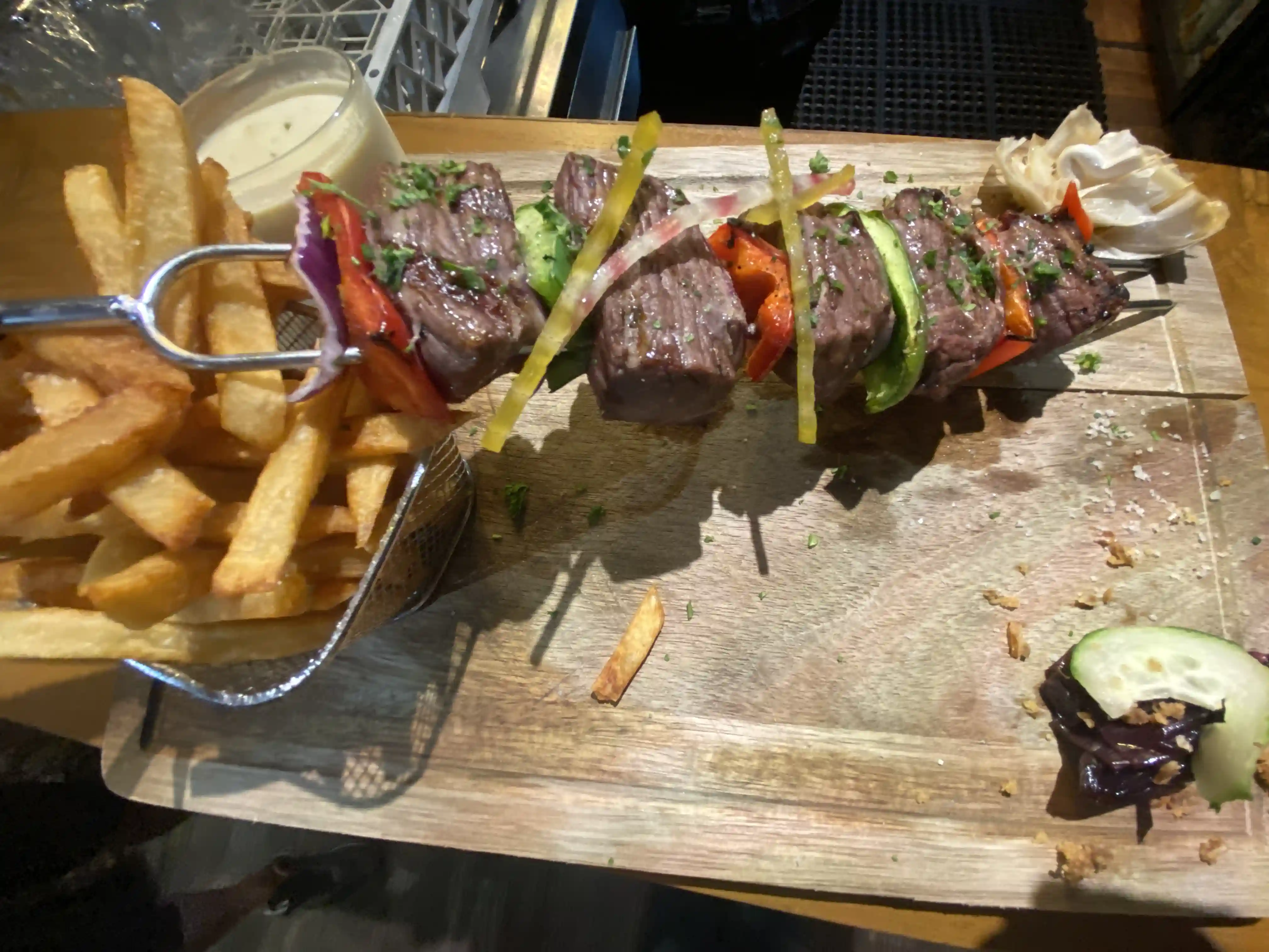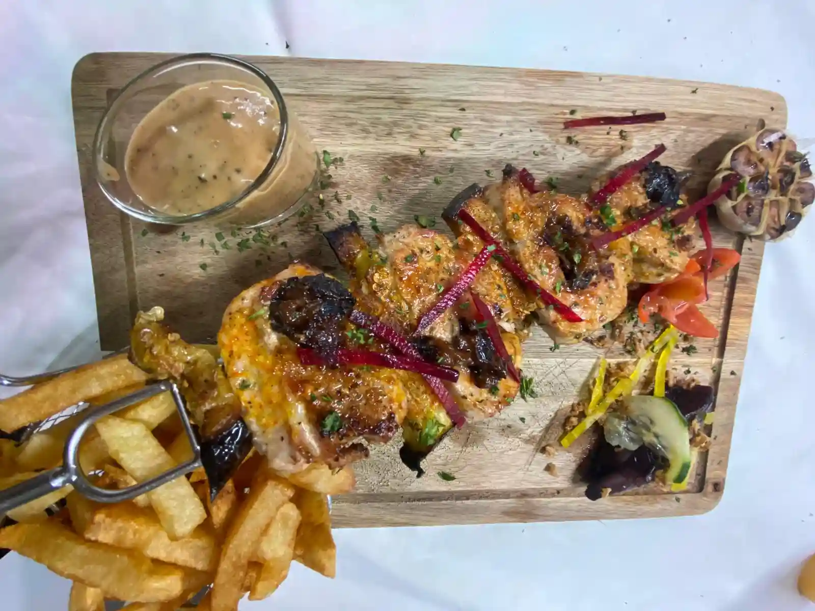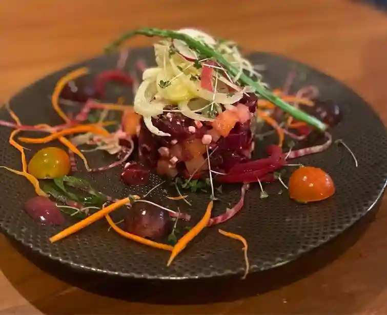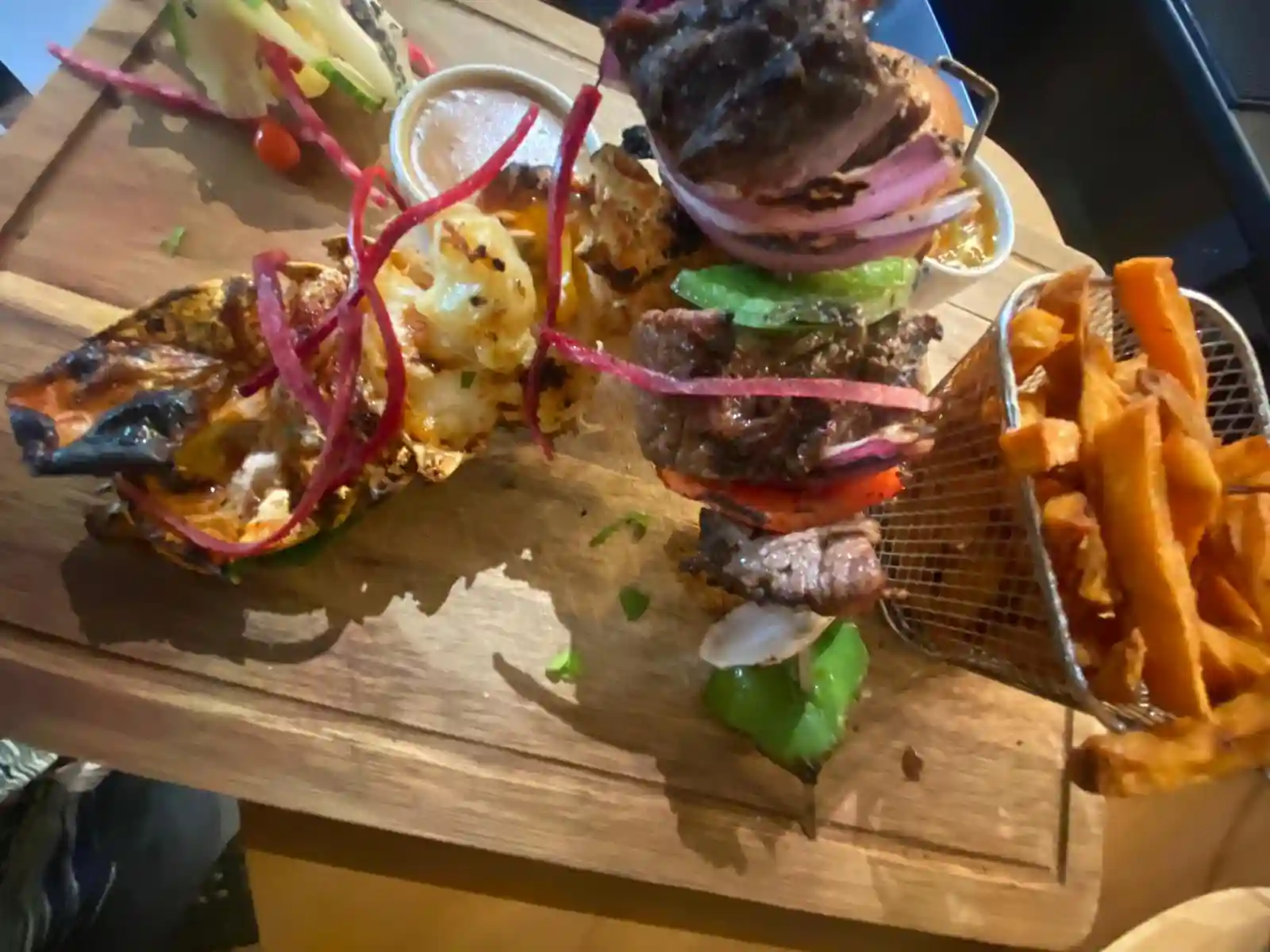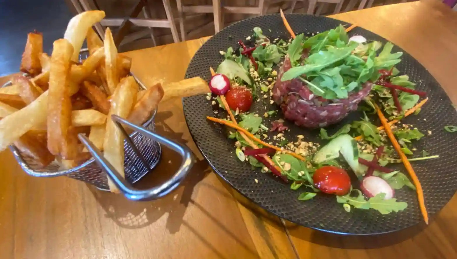 Sans frites ,à base de boeuf, Huile de Truffe ,Tomate séché, Aubergines grillé ,Parmesan , Persil ,Noisette