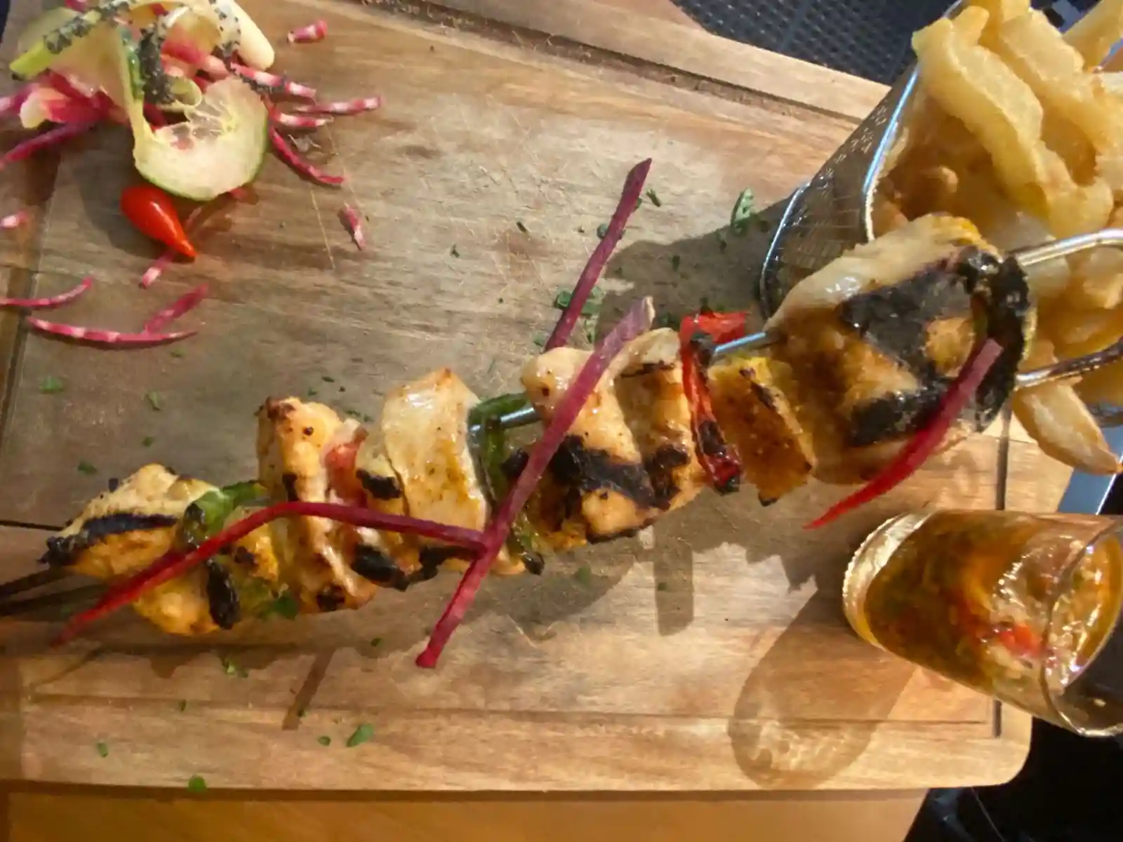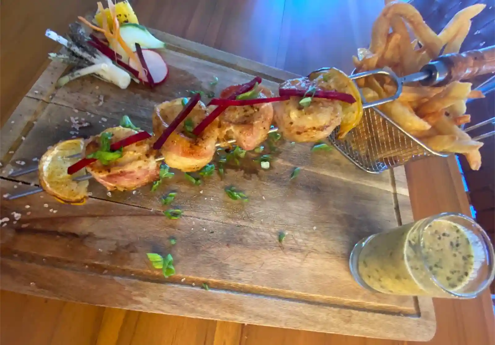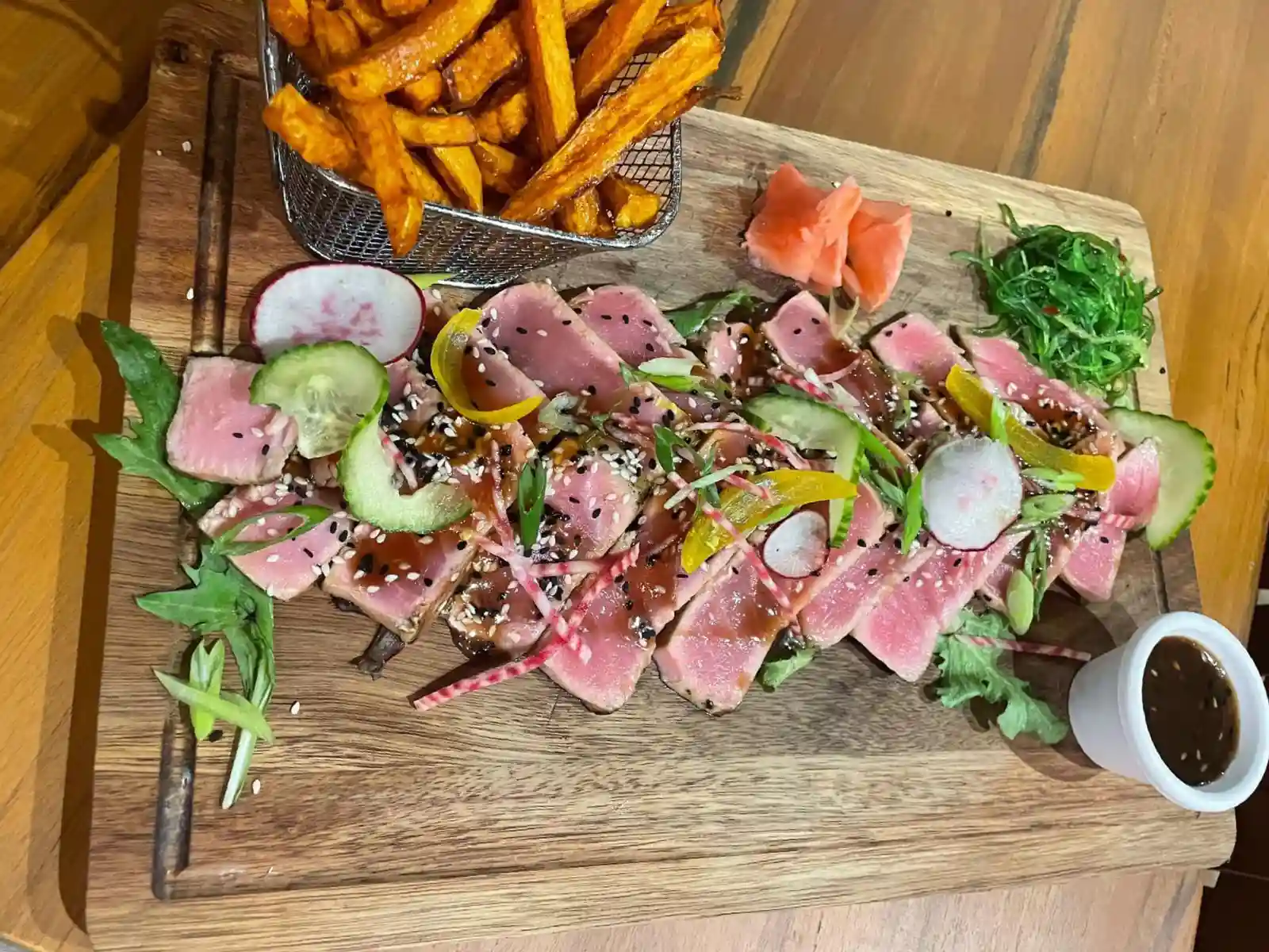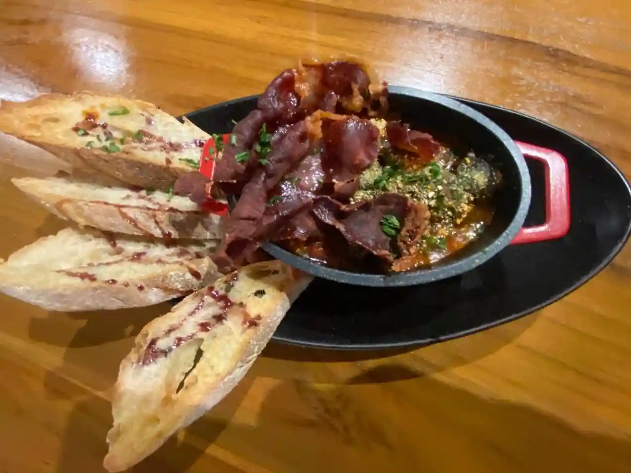 Sans frites ,à base de boeuf, Huile de Truffe ,Tomate séché, Aubergines grillé ,Parmesan , Persil ,Noisette