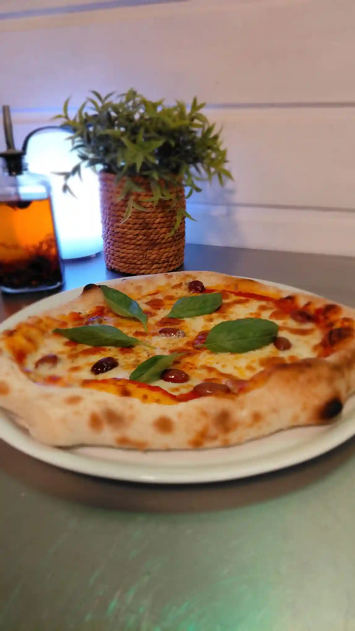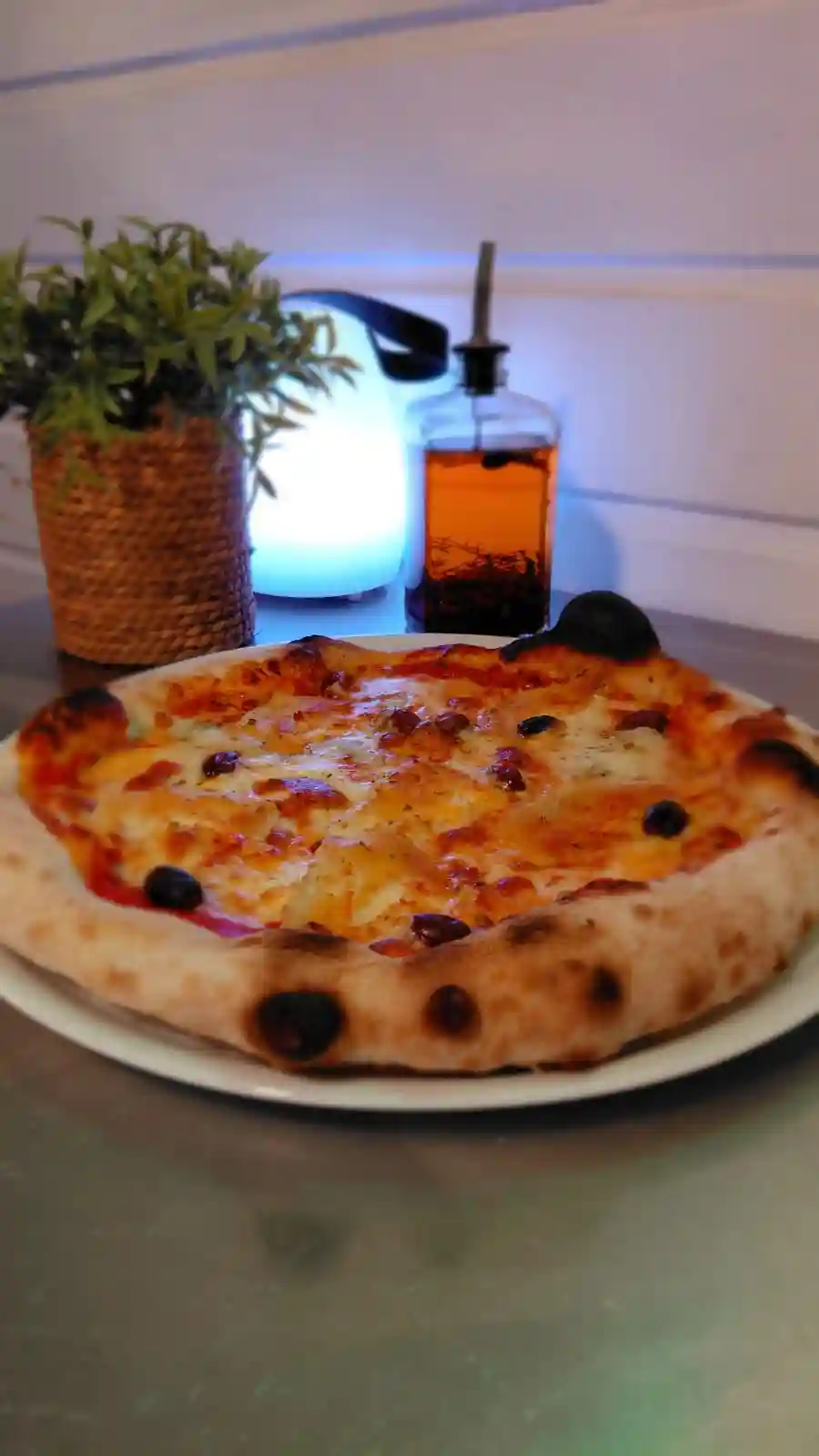 Base tomate ou crème, Mozzarella, Chèvre, Gorgonzola, Olives, Origan
