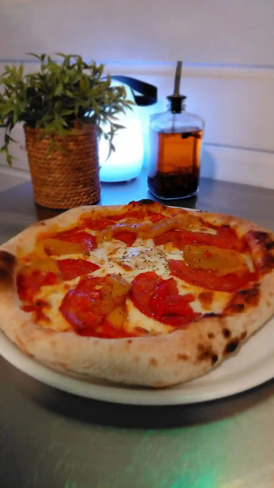 Base tomate, Mozzarella, Chorizo, Poivrons marinés, Oeuf, Origan