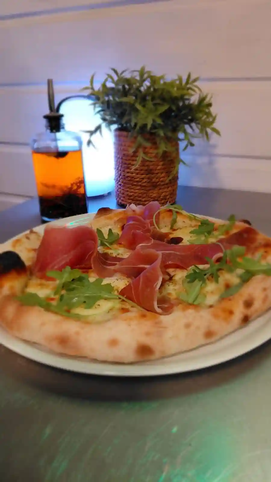 Base tomate, Mozzarella Di Buffala, Roquette, Tomates cerises, Parmesan, Jambon cru, Pesto, Pignons de pin