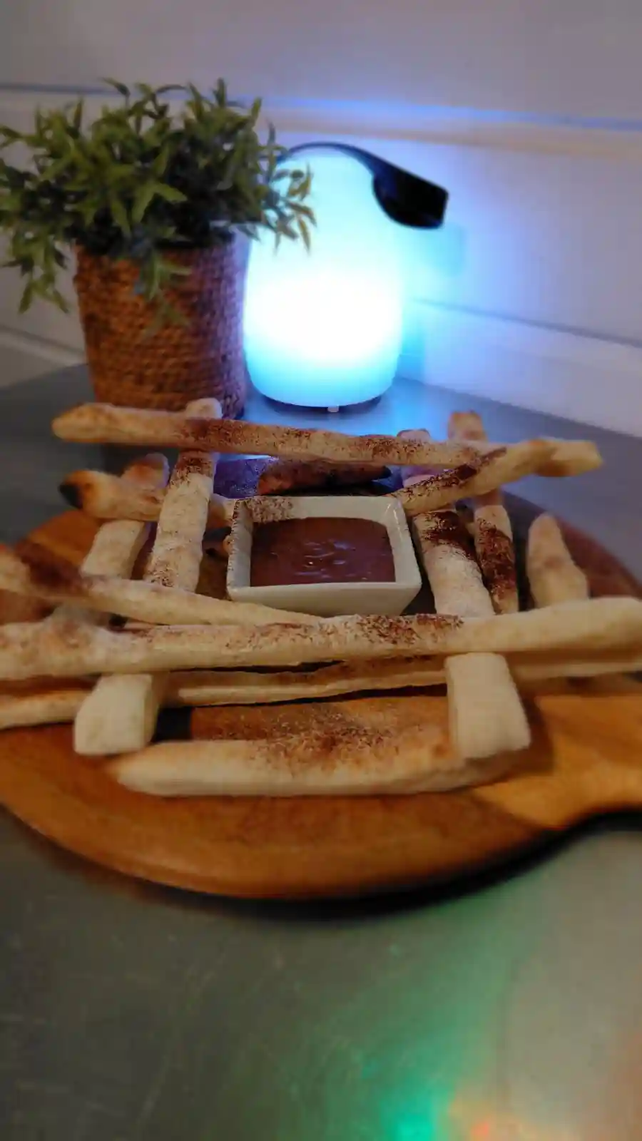 Mikado de pâte à pizza, Sucre glace, Nutella chaud