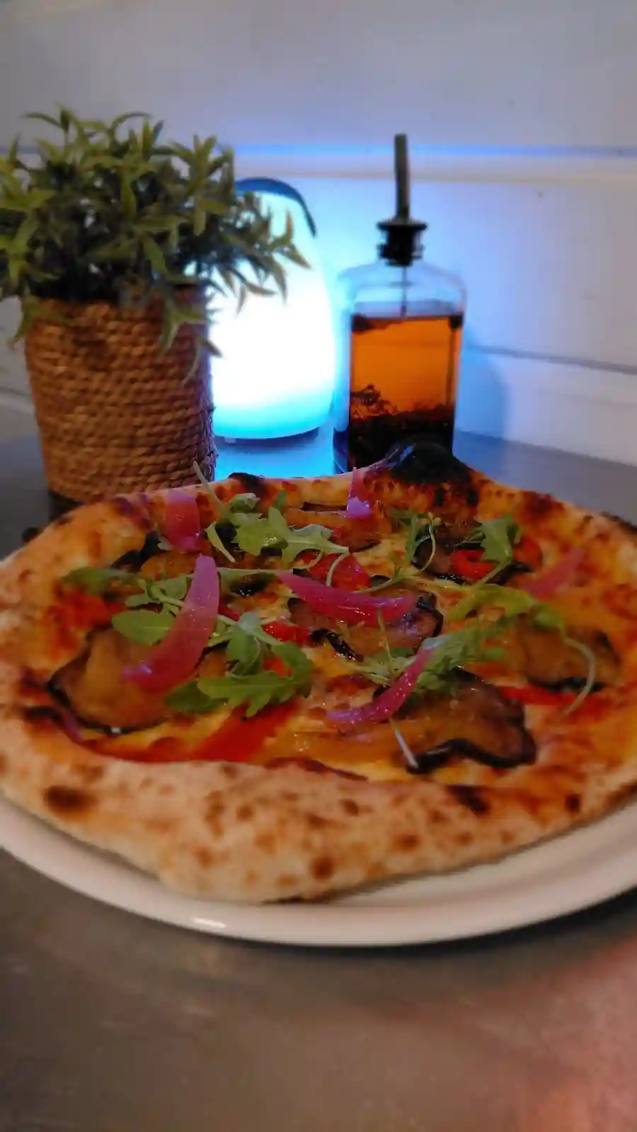 Base tomate, Mozzarella, Poivrons, Aubergines, Pickles, Roquette, Pesto