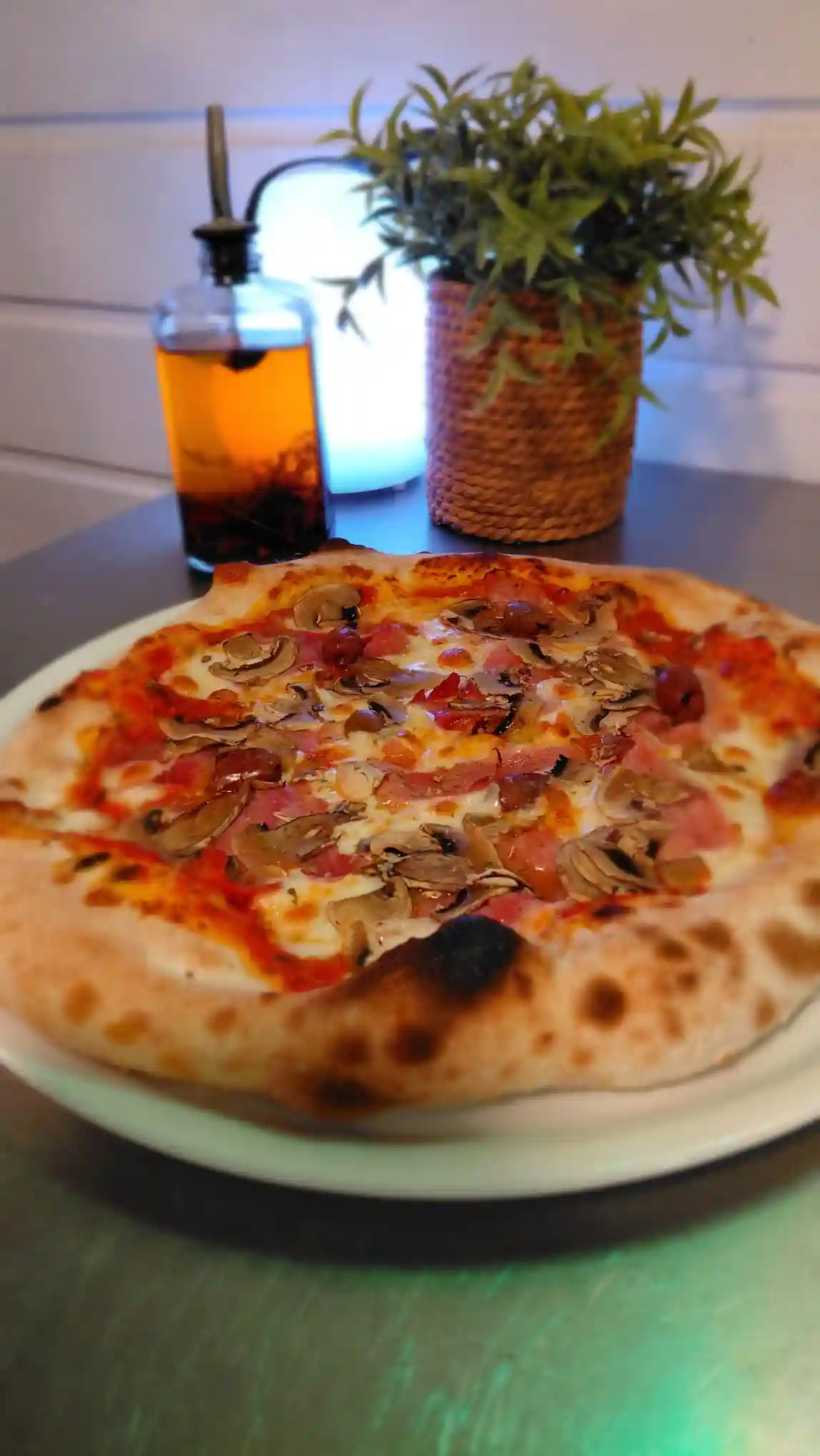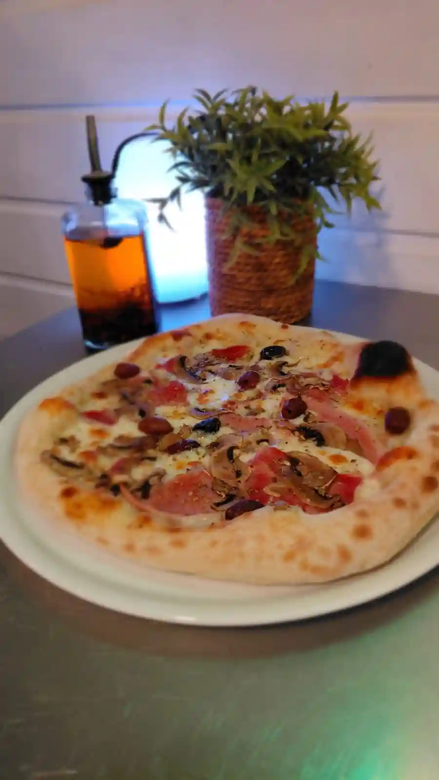 Base tomate, Mozzarella, Jambon blanc, Champignons, Olives, Origan